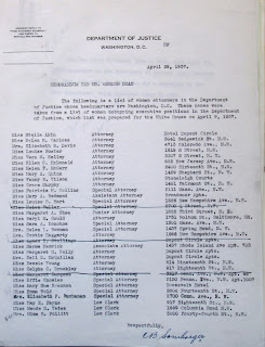 Tallies of women lawyers in the federal government during the New Deal are hard to come by, so whenever I stumble upon one, I like to circulate it. At right is a list of the "Portias" of the Department of Justice, circa 1937. It is from the Personal Papers of Gordon Dean, box 5, entry A1: 140, RG 60 at National Archives 2.